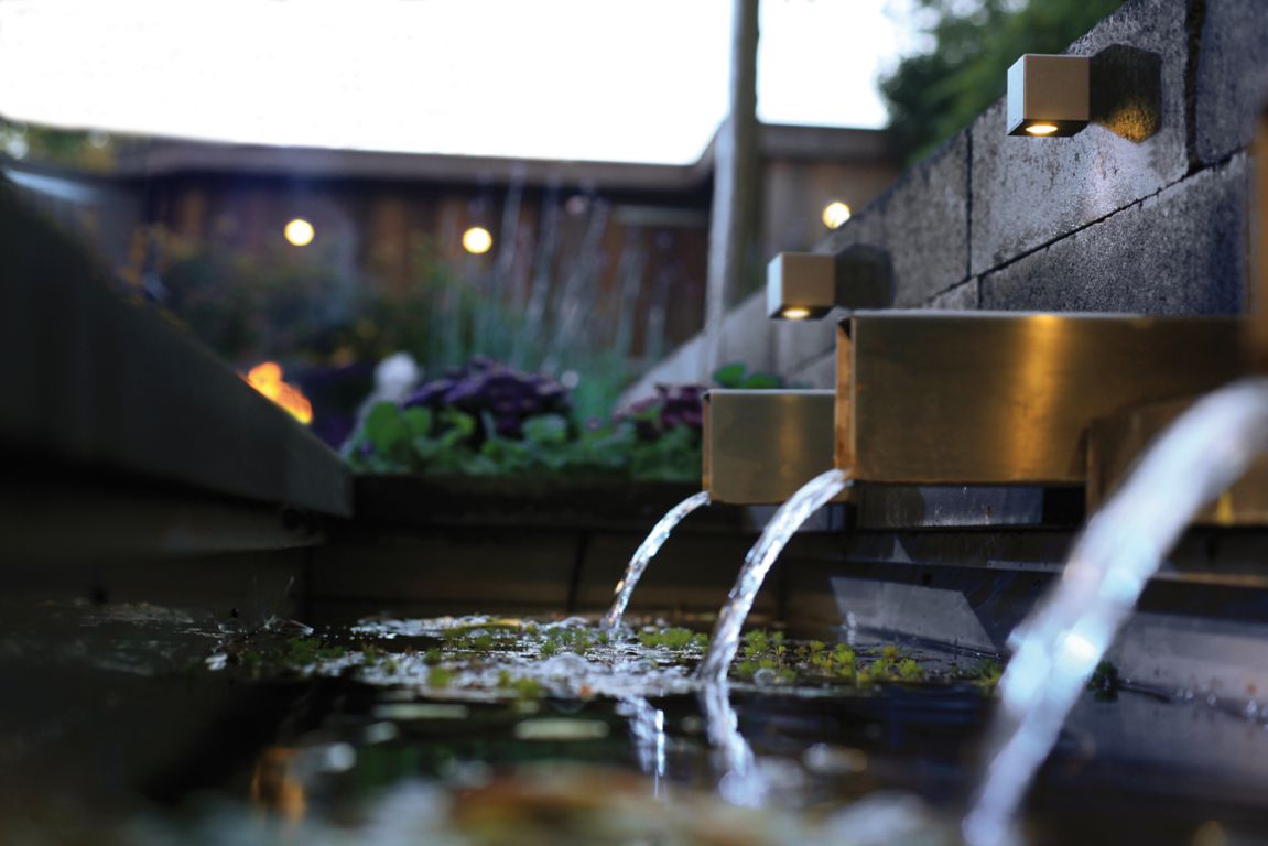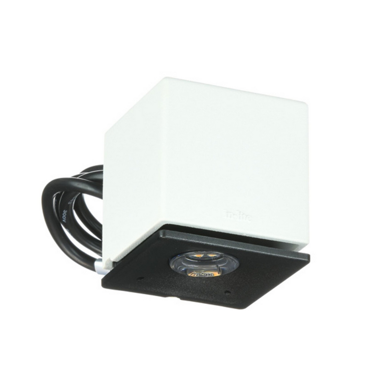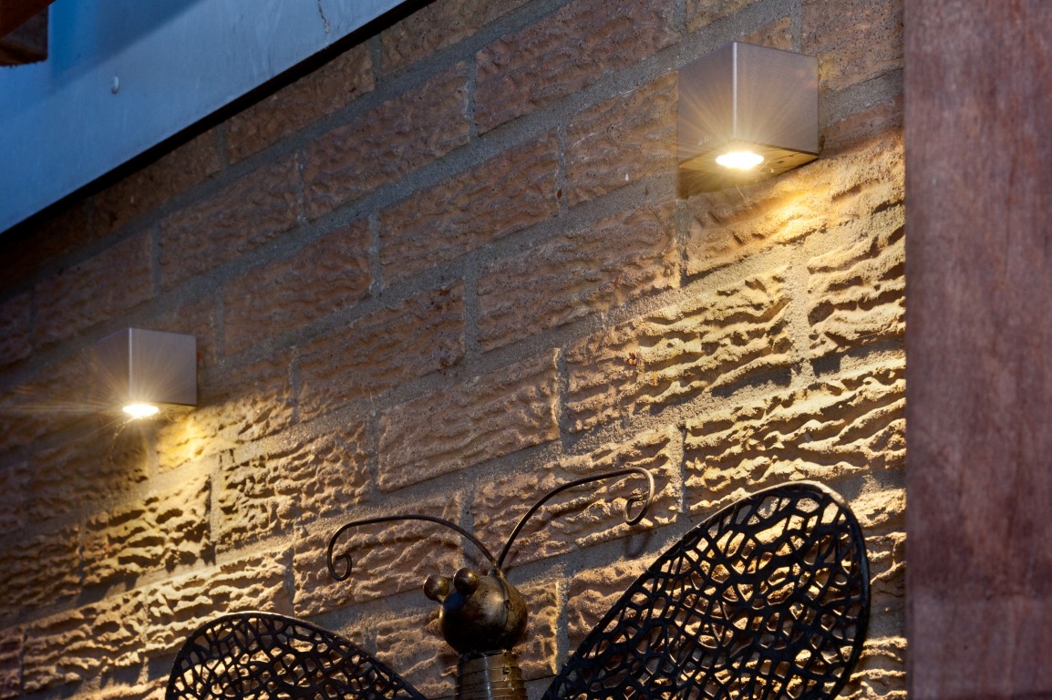 Subtiel kubusvormig wandarmatuur in warm zilver gecoat aluminium. Geeft een Warm White licht.CUBID is geschikt voor bijvoorbeeld vijverranden en pergola's.